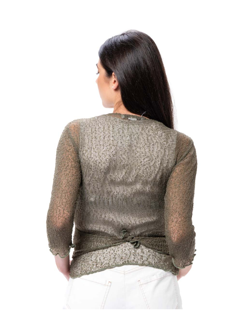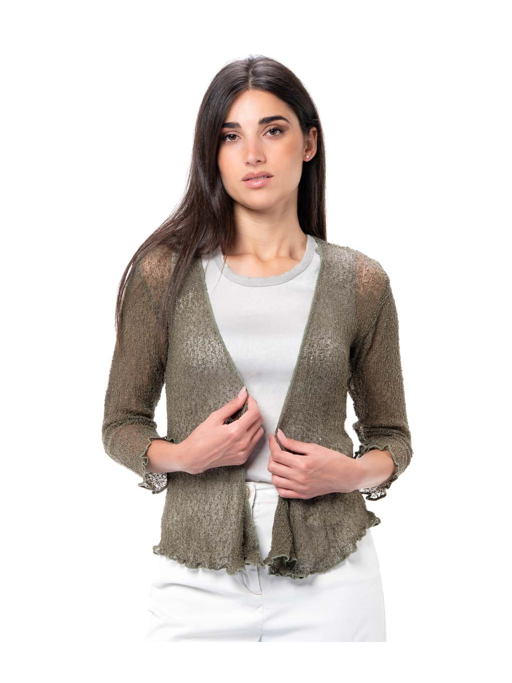 Krátký svetřík Galateia je velmi pohodlný a díky síťované struktuře je částečně elastický. Je krásně splývavý, velikost je univerzální a není třeba si s ní lámat hlavu. Lehký svetřík Eudora působí krásně žensky na jakékoliv postavě. Dá se nosit otevřený s volně spuštěnými cípy, což působí velmi efektně, nebo lze cípy zavázat vpředu na uzel. Má tříčtvrteční rukáv. Vypadá krásně v kombinaci s ramínkovými letními šaty, kdy v případě potřeby schová ramena.