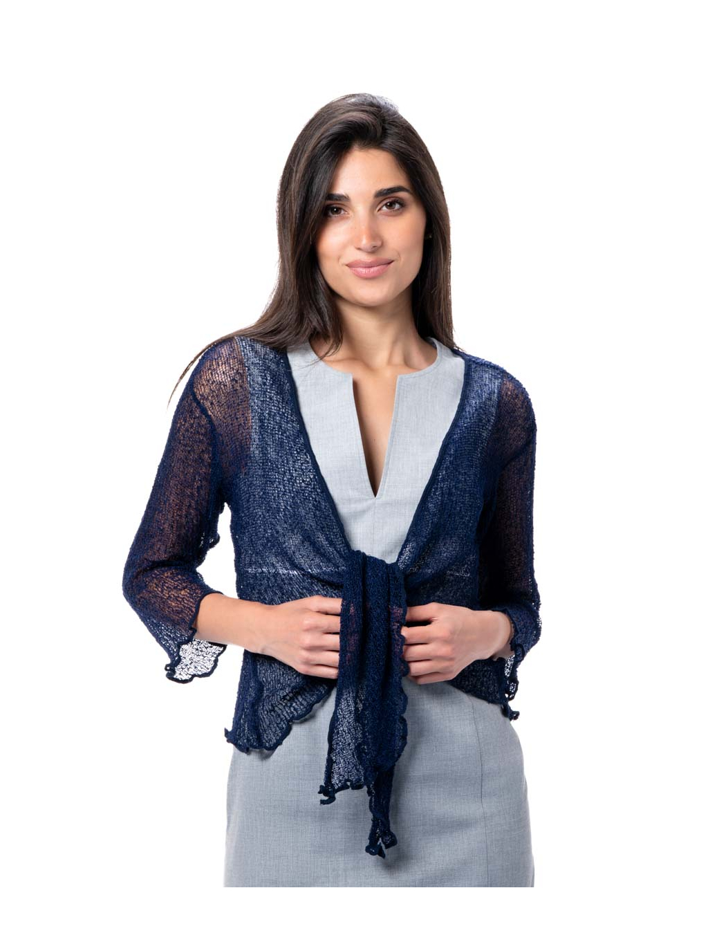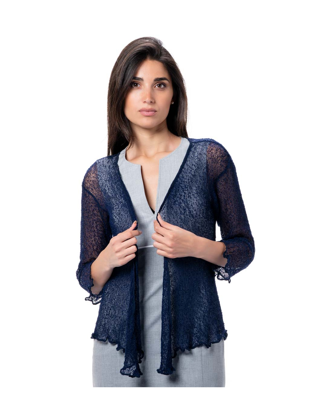 Krátký svetřík Galateia je velmi pohodlný a díky síťované struktuře je částečně elastický. Je krásně splývavý, velikost je univerzální a není třeba si s ní lámat hlavu. Lehký svetřík Eudora působí krásně žensky na jakékoliv postavě. Dá se nosit otevřený s volně spuštěnými cípy, což působí velmi efektně, nebo lze cípy zavázat vpředu na uzel. Má tříčtvrteční rukáv. Vypadá krásně v kombinaci s ramínkovými letními šaty, kdy v případě potřeby schová ramena.
