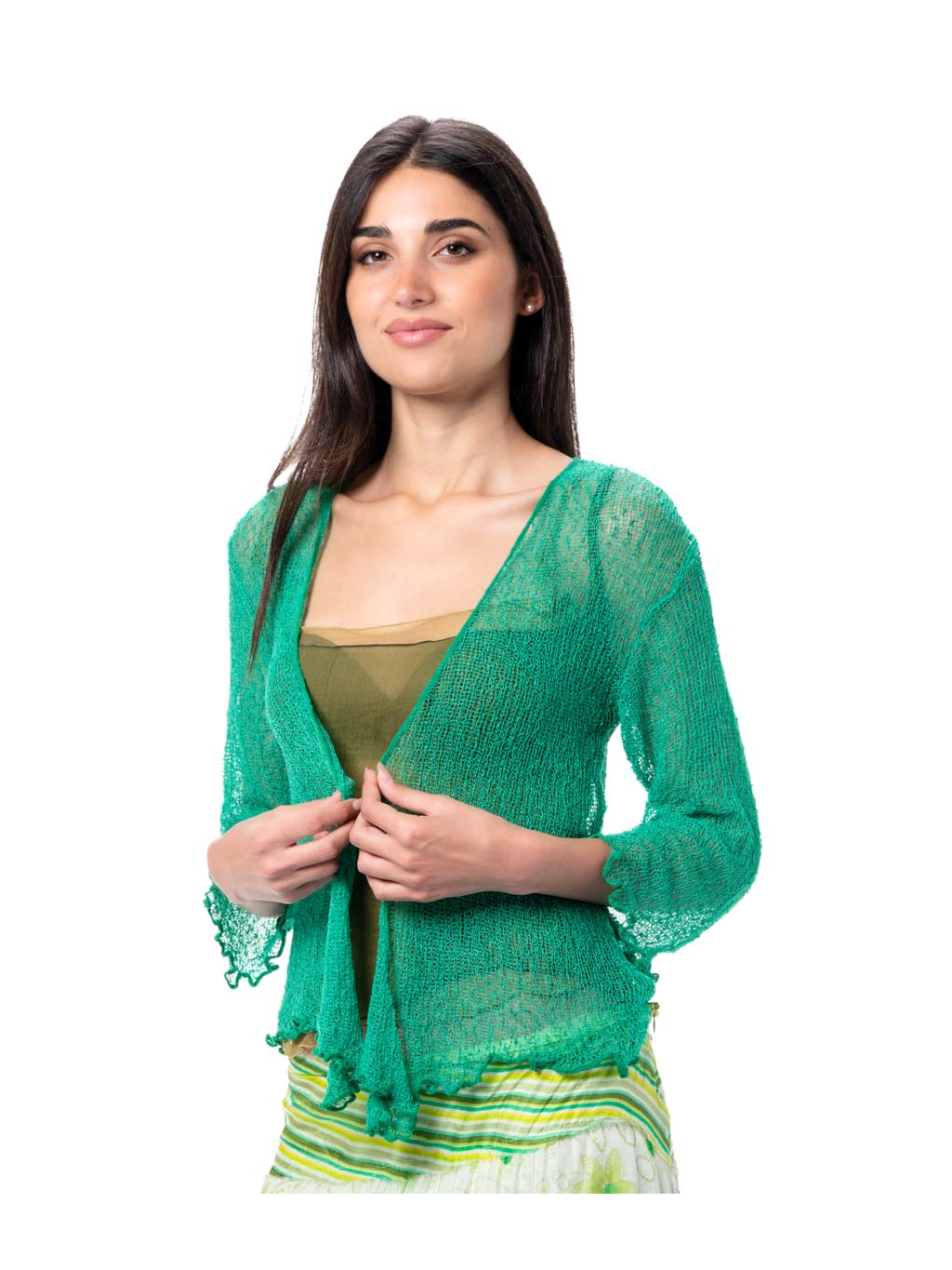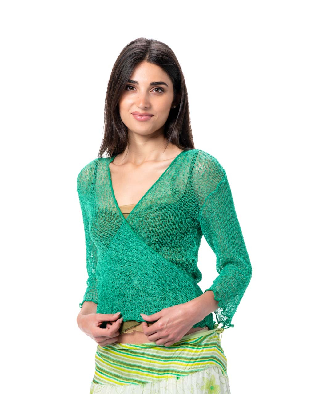 Krátký svetřík Galateia je velmi pohodlný a díky síťované struktuře je částečně elastický. Je krásně splývavý, velikost je univerzální a není třeba si s ní lámat hlavu. Lehký svetřík Eudora působí krásně žensky na jakékoliv postavě. Dá se nosit otevřený s volně spuštěnými cípy, což působí velmi efektně, nebo lze cípy zavázat vpředu na uzel. Má tříčtvrteční rukáv. Vypadá krásně v kombinaci s ramínkovými letními šaty, kdy v případě potřeby schová ramena.