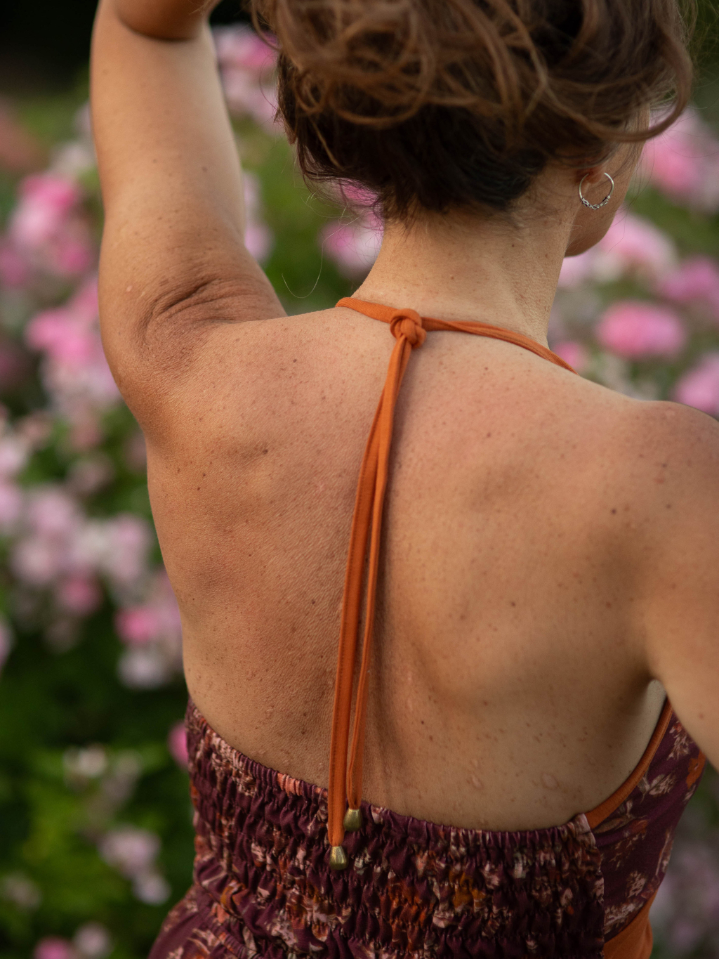 Letní šaty s hlubokým V-výstřihem a zavazováním za krkem jsou navržené tak, aby lichotily přirozeným křivkám tvého těla. Bez podprsenky vypadají nejlépe na menším a středním poprsí - dávají ti svobodu a přirozený, uvolněný vzhled.