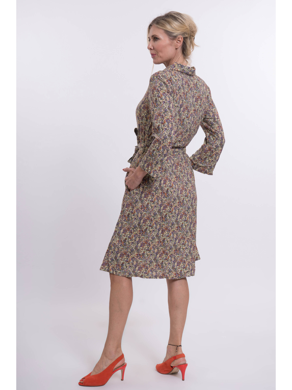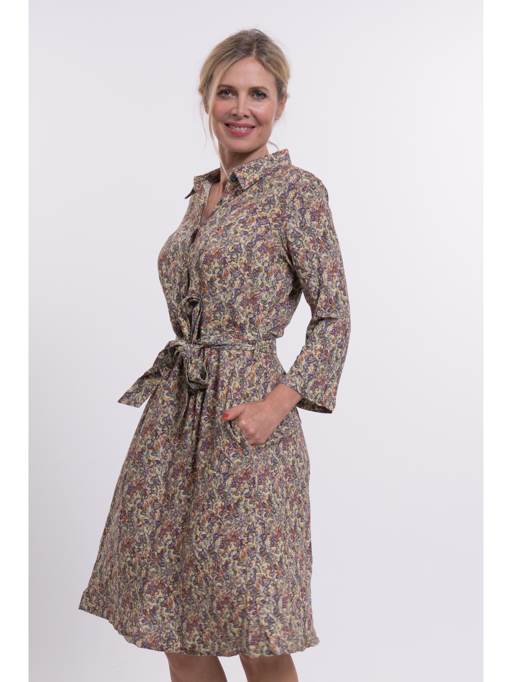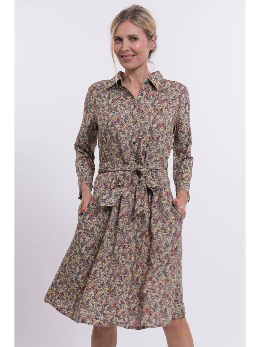 Slušivý střih do A, rozepínací knoflíková léga, pásek na zavázání, límeček Kent a boční kapsy - to jsou šaty Dida!