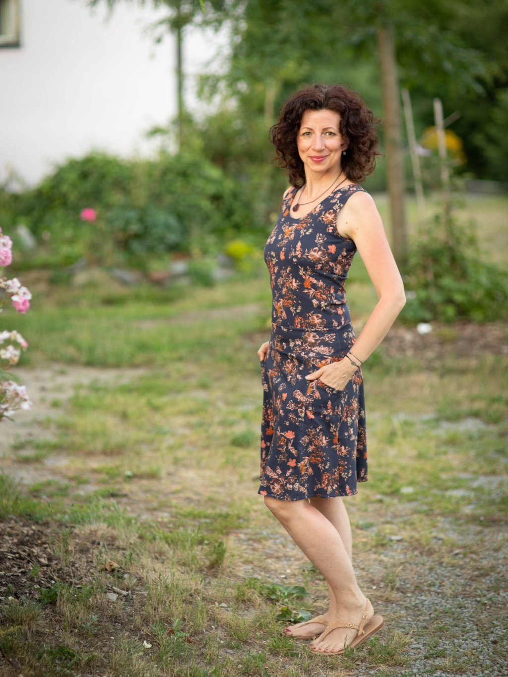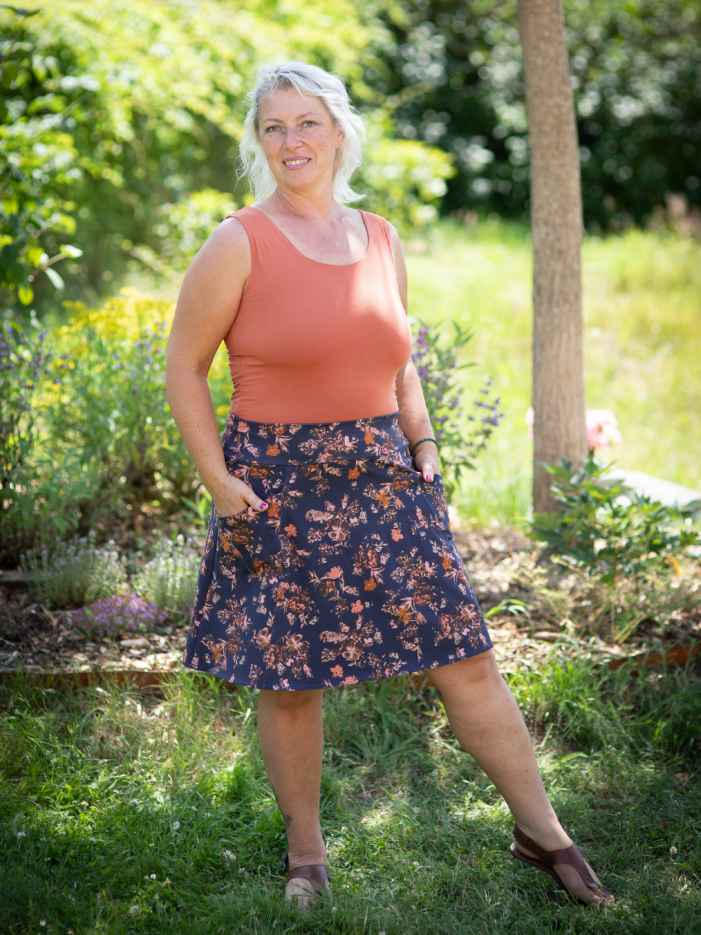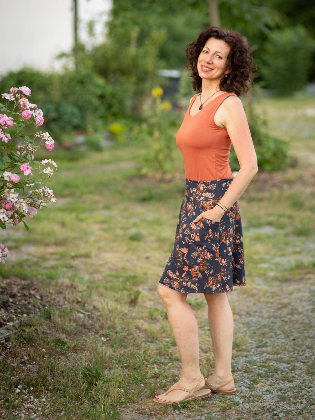 Bavlněnou sukni Gréta můžeš sladit s bavlněným tílkem Klára ve stejném vzoru a vytvořit tak dojem šatů, nebo vytvořit ostrý kontrast s bambusovým tílkem v jiné barevné variantě.