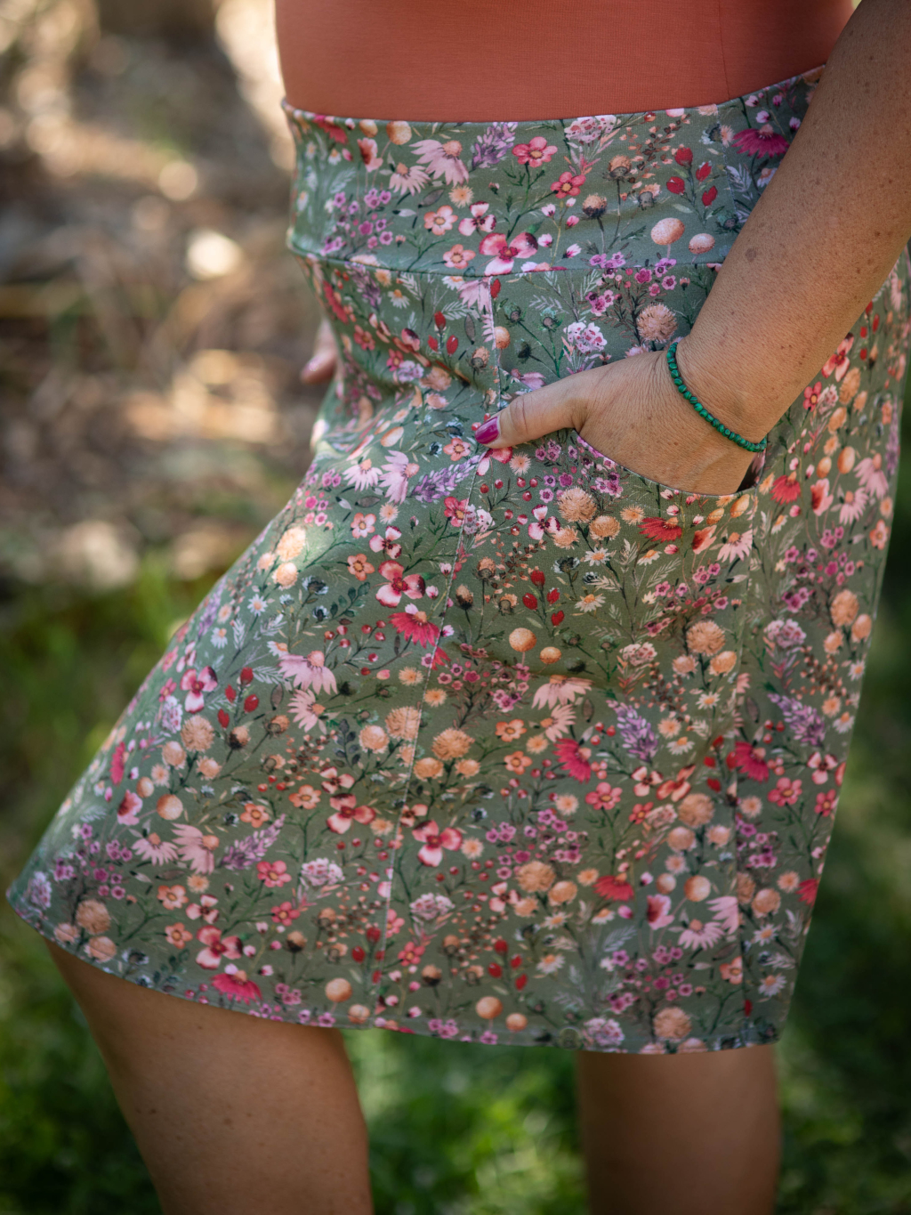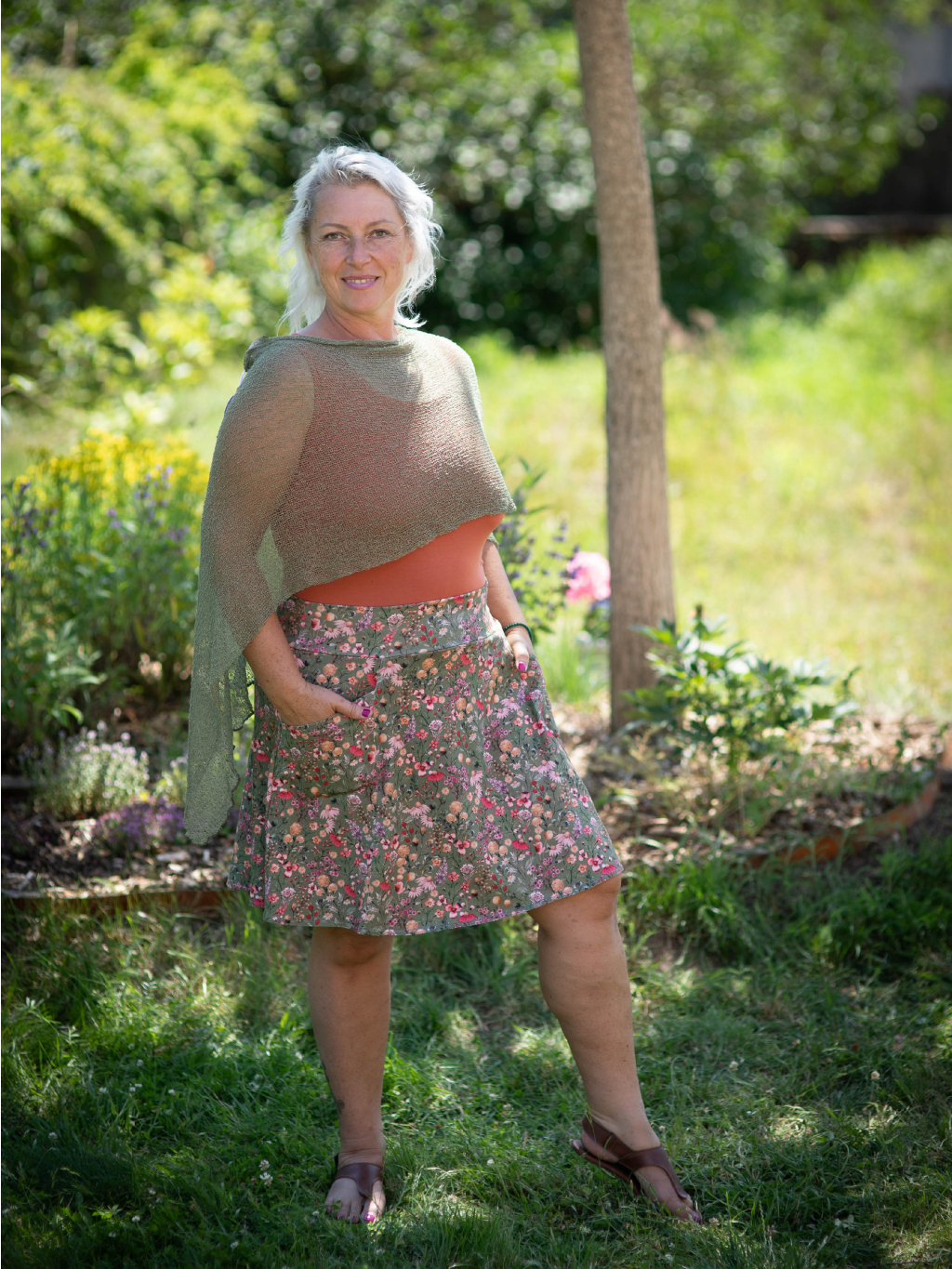 Bavlněnou sukni Gréta můžeš sladit s bavlněným tílkem Klára ve stejném vzoru a vytvořit tak dojem šatů, nebo vytvořit ostrý kontrast s bambusovým tílkem v jiné barevné variantě.