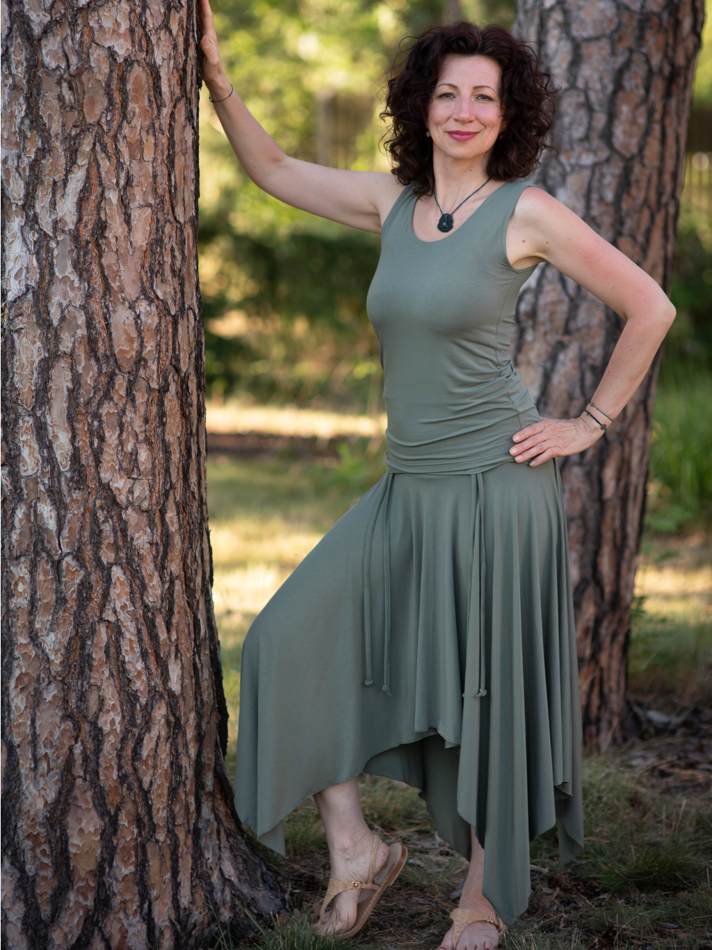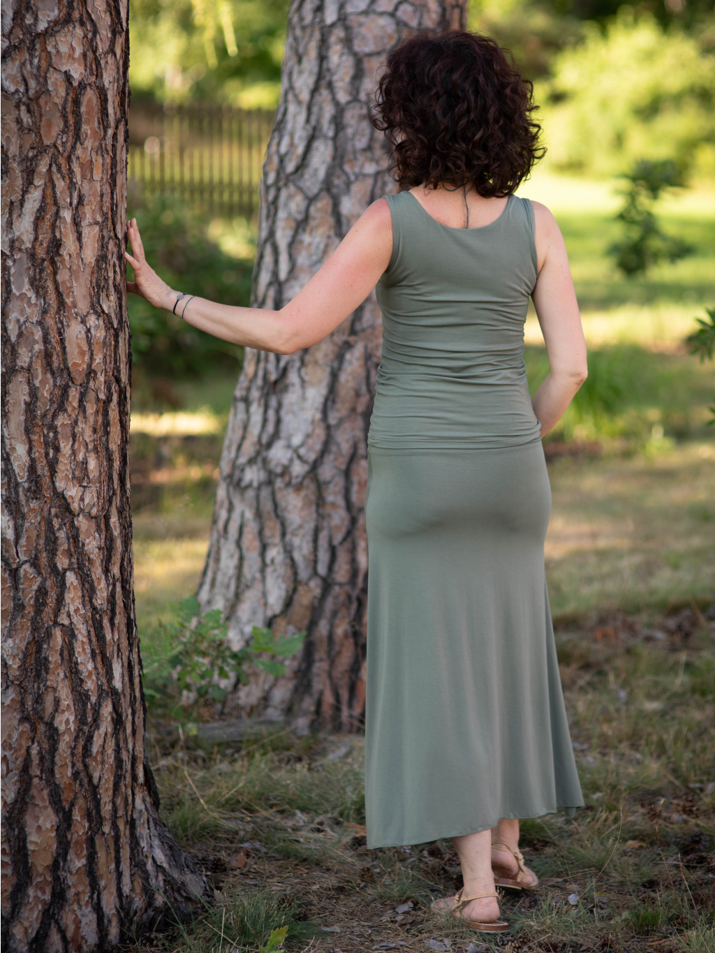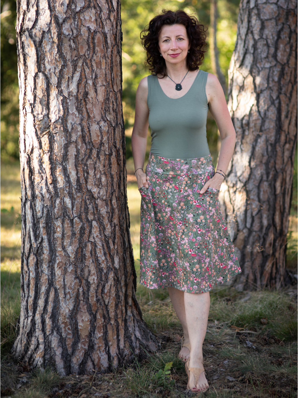 Bambusové tílko Klára můžeš sladit se sukní Gréta, sukní Natalia nebo s šaty Sára oblečenými jako dlouhou sukni - obojí ve stejné barvě a vytvořit tak dojem šatů. Skvěle také vypadá v kombinaci s květinovými variantami této sukně ať už v délce nad nebo pod kolena. Pokud miluješ dlouhé sukně a romantický look, doporučujeme vyzkoušet variantu se sukní Chiara z bavlny nebo v kombinaci bavlna + len.