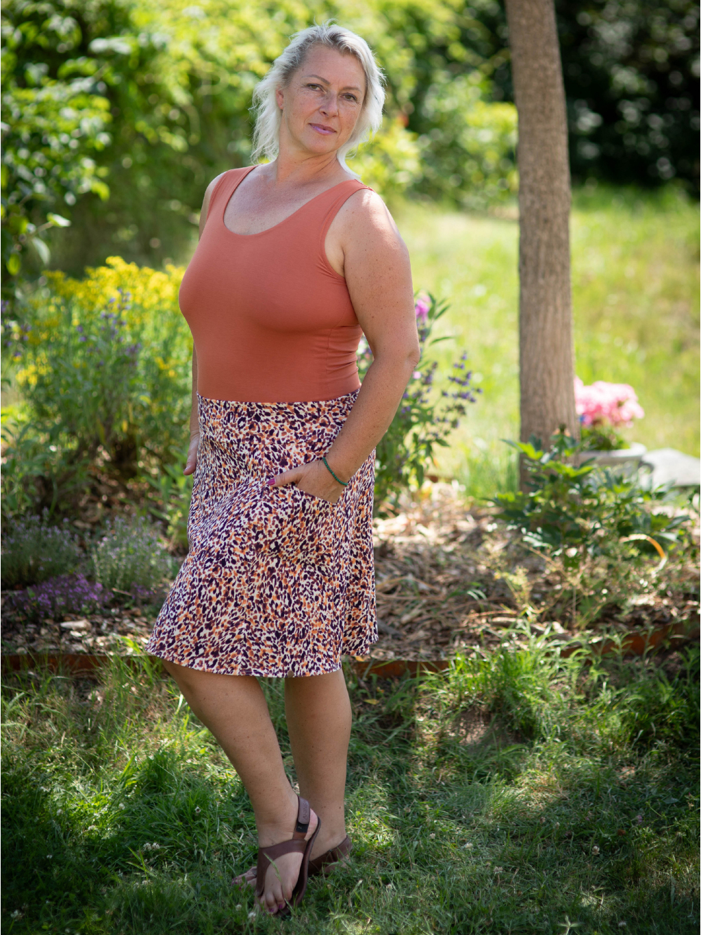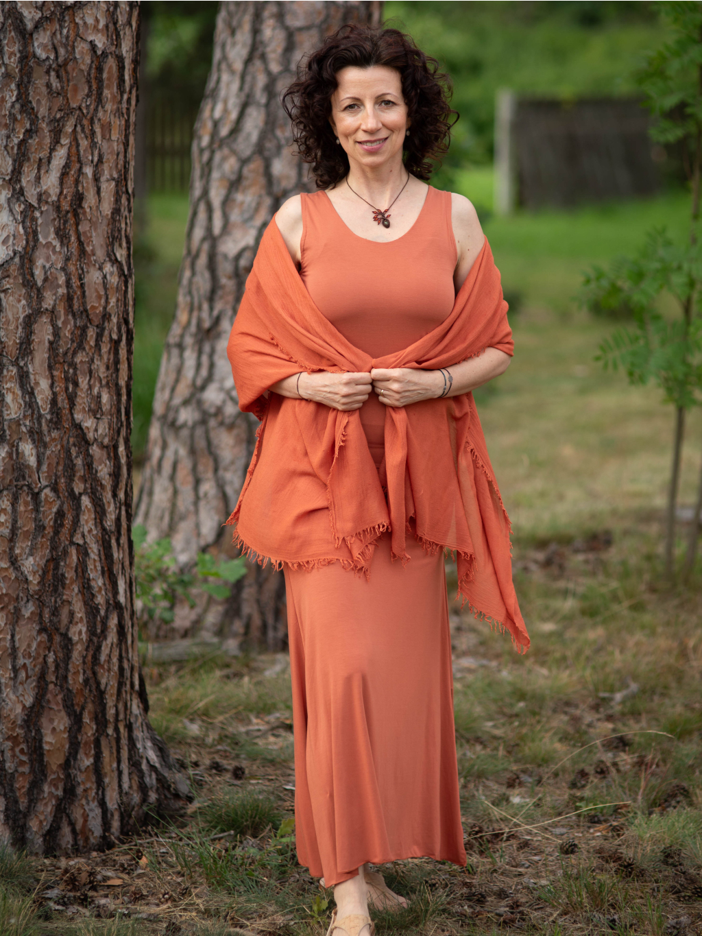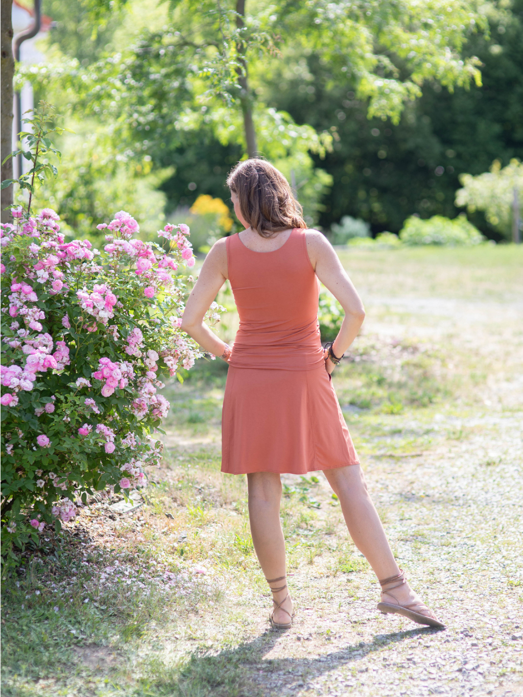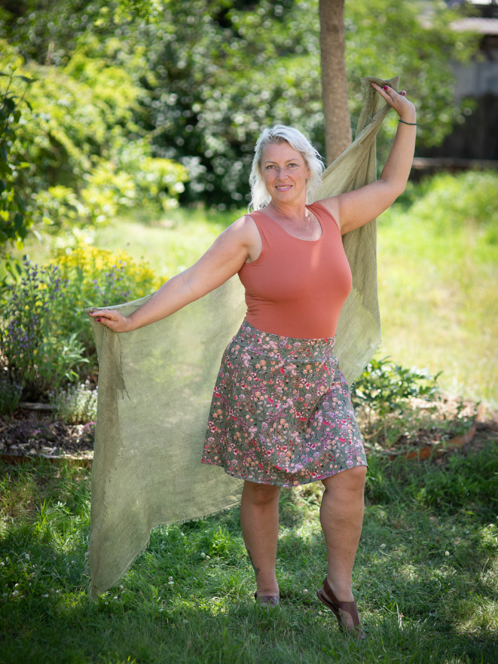 Bambusové tílko Klára můžeš sladit se sukní Gréta, sukní Natalia nebo s šaty Sára oblečenými jako dlouhou sukni - obojí ve stejné barvě a vytvořit tak dojem šatů. Skvěle také vypadá v kombinaci s květinovými variantami této sukně ať už v délce nad nebo pod kolena. Pokud miluješ dlouhé sukně a romantický look, doporučujeme vyzkoušet variantu se sukní Chiara z bavlny nebo v kombinaci bavlna + len.