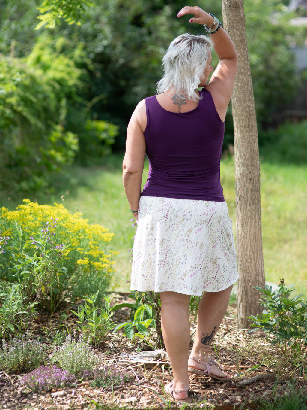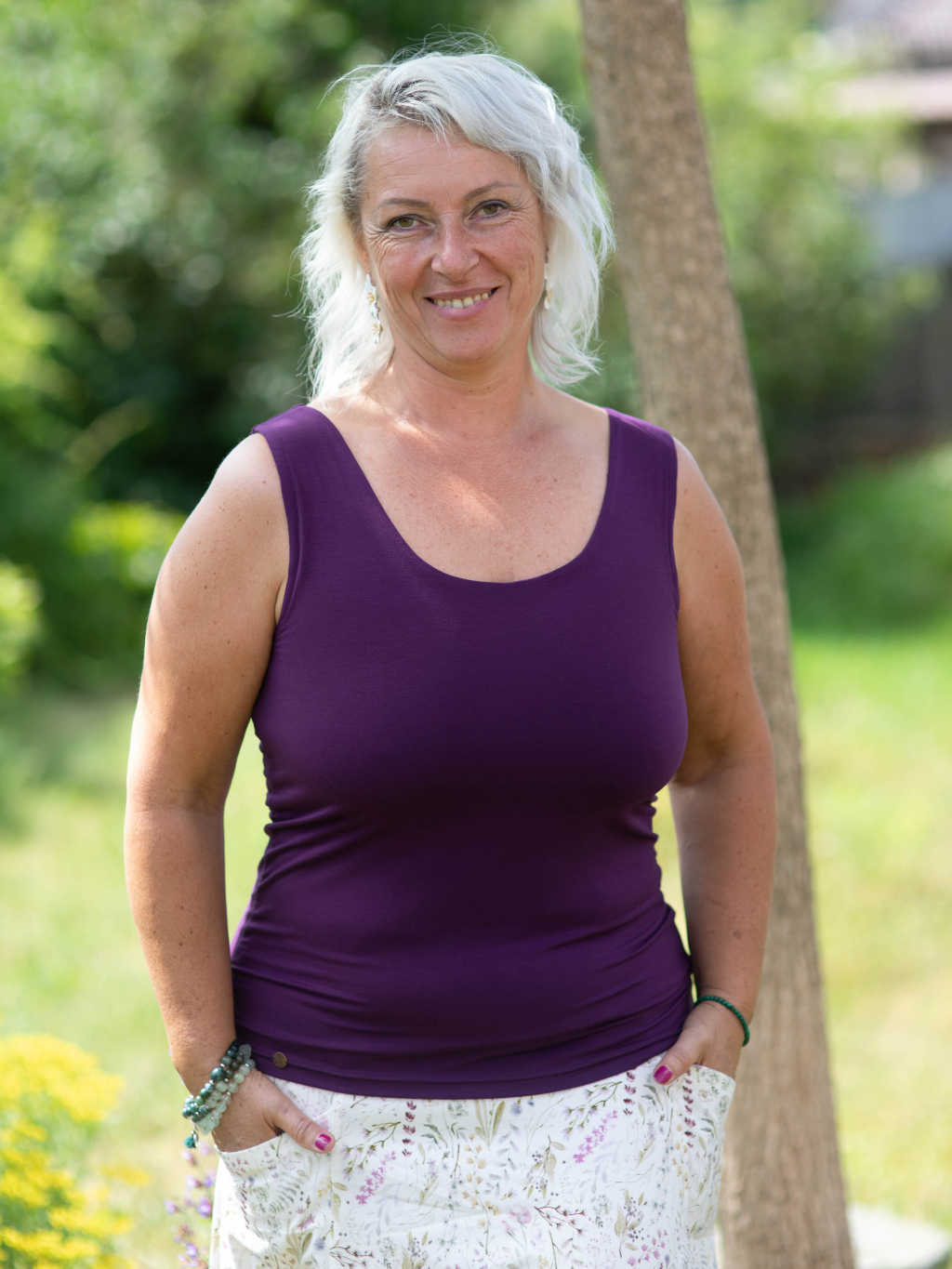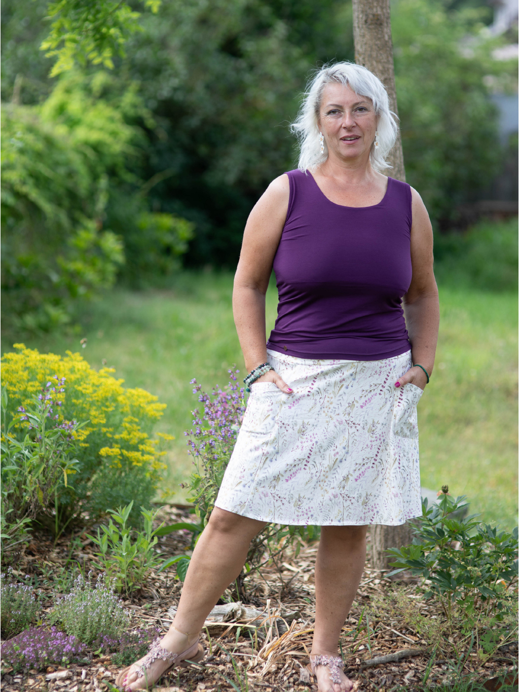 Bambusové tílko Klára můžeš sladit se sukní Gréta, sukní Natalia nebo s šaty Sára oblečenými jako dlouhou sukni - obojí ve stejné barvě a vytvořit tak dojem šatů. Skvěle také vypadá v kombinaci s květinovými variantami této sukně ať už v délce nad nebo pod kolena. Pokud miluješ dlouhé sukně a romantický look, doporučujeme vyzkoušet variantu se sukní Chiara z bavlny nebo v kombinaci bavlna + len.